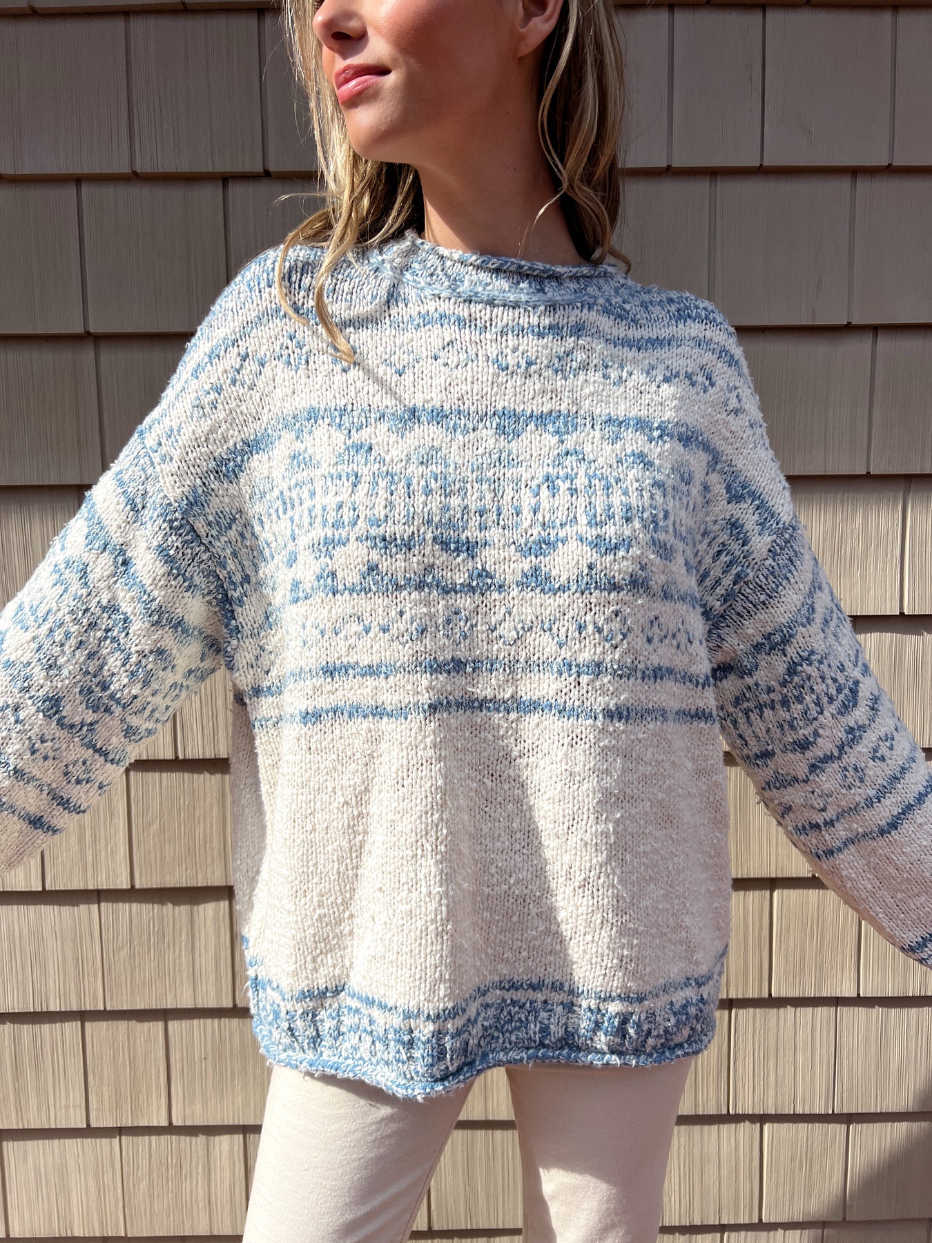 Wrap yourself in relaxed luxury with this Free People Dani Pattern Sweater, where timeless Fair Isle-inspired design meets contemporary ease. The generously oversized silhouette and soft cotton-blend knit create an inviting layer that transitions seamlessly from casual weekends to cozy evenings. Wide cuff sleeves and a classic crew neckline add refined detail, while the chunky knit construction delivers substantial comfort. Hand wash cold to preserve the sweater's quality and keep it looking fresh season after season.