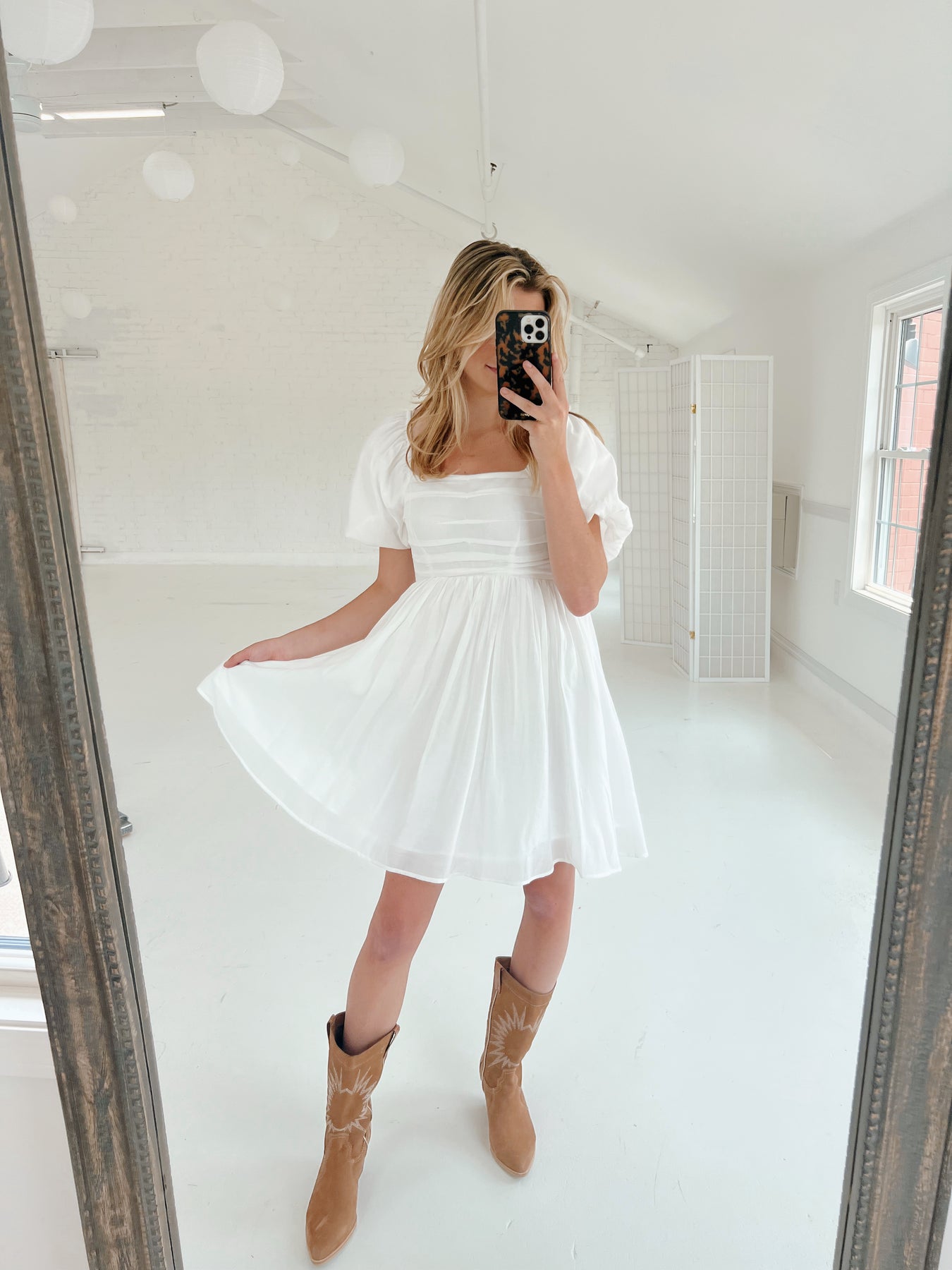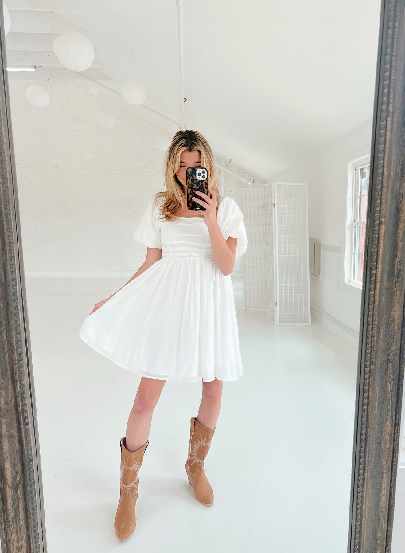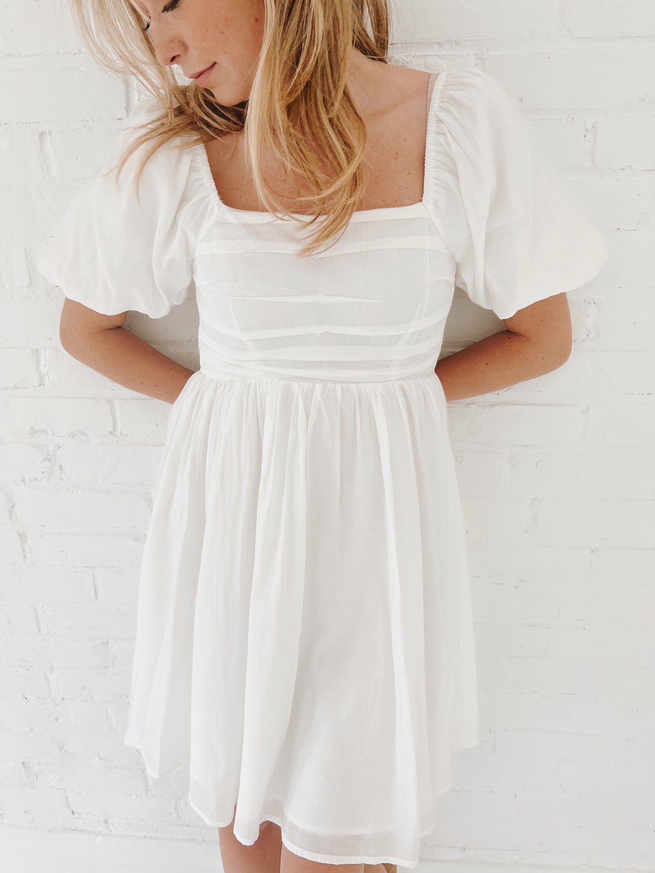 Details: Length: 34" Bust: 28" Materials: 75% Tencel 25% Polyester Color: White Fit: Puffed sleeve flowy lined mini dress.