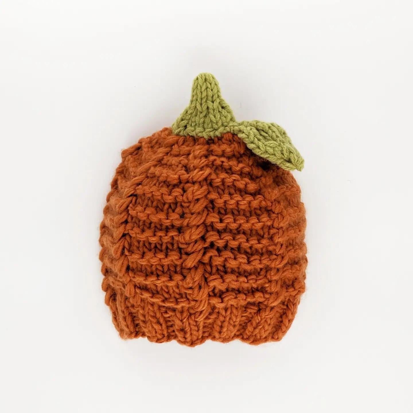 Knit in a cozy, muted Orange hue, this fun hat is shaped like a pumpkin and topped with a green leaf. It's the perfect for all fall holidays! Our hats are partially knit from recycled, sustainable Polyester yarn made from plastic bottles. We are on a mission to help reduce the world's plastic pollution problem ♻ • Hand Knit • 60% Acrylic, 40% Recycled Polyester • Hand Wash