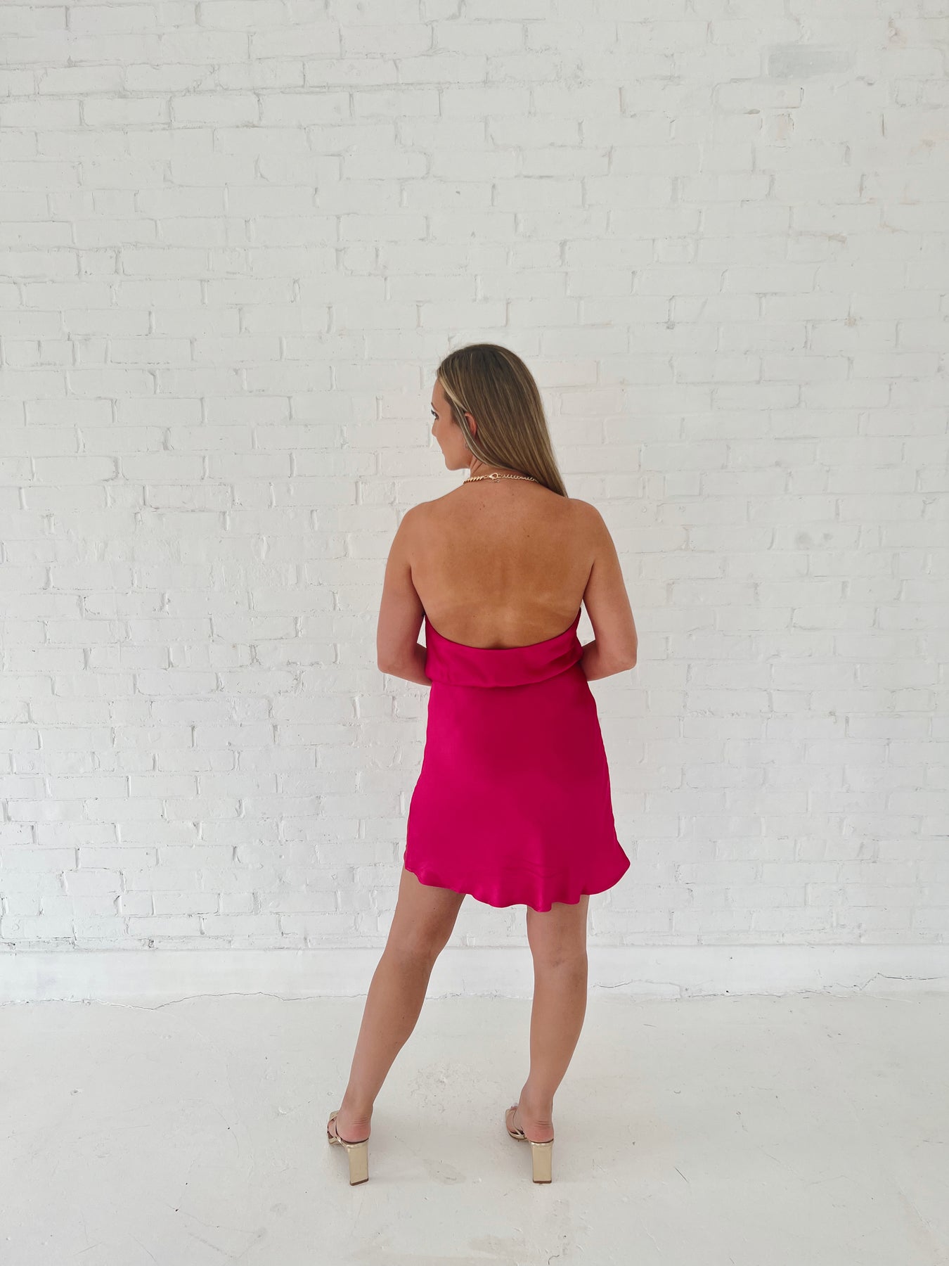 This satin dress features a halter neckline with a chain strap closure. Relaxed bodice leads to a cinched waist and abbreviated hem. Side slit accent. Open back.