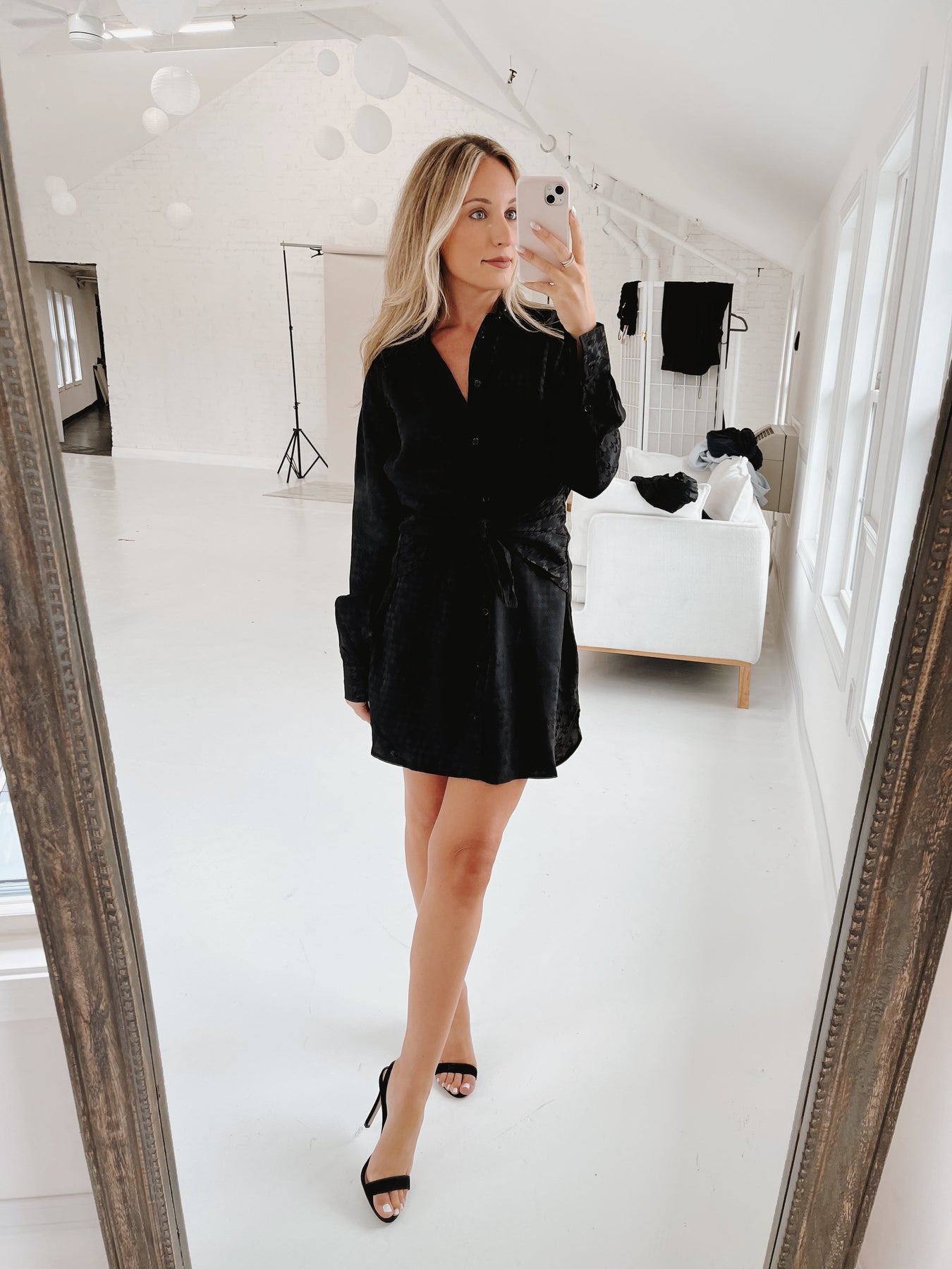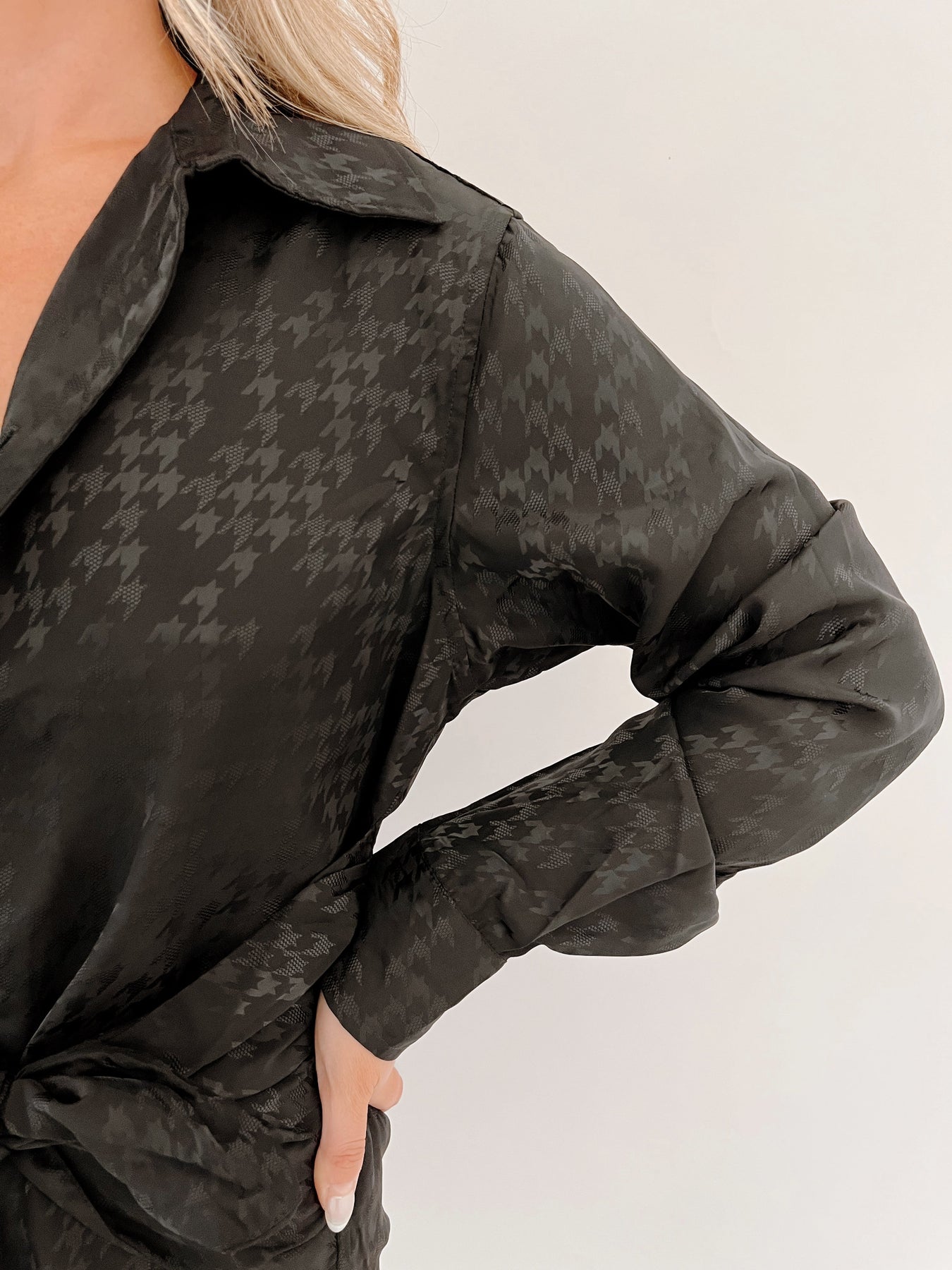 Back to black in the Back To The City Mini! This monochromatic houndstooth mini dress is sure to be a staple in your closet. Featuring a collar, button up detailing and long sleeves - It's wrapped waist is sure to give you a fitted look while still feeling comfortable. It's a 100% YES from us!