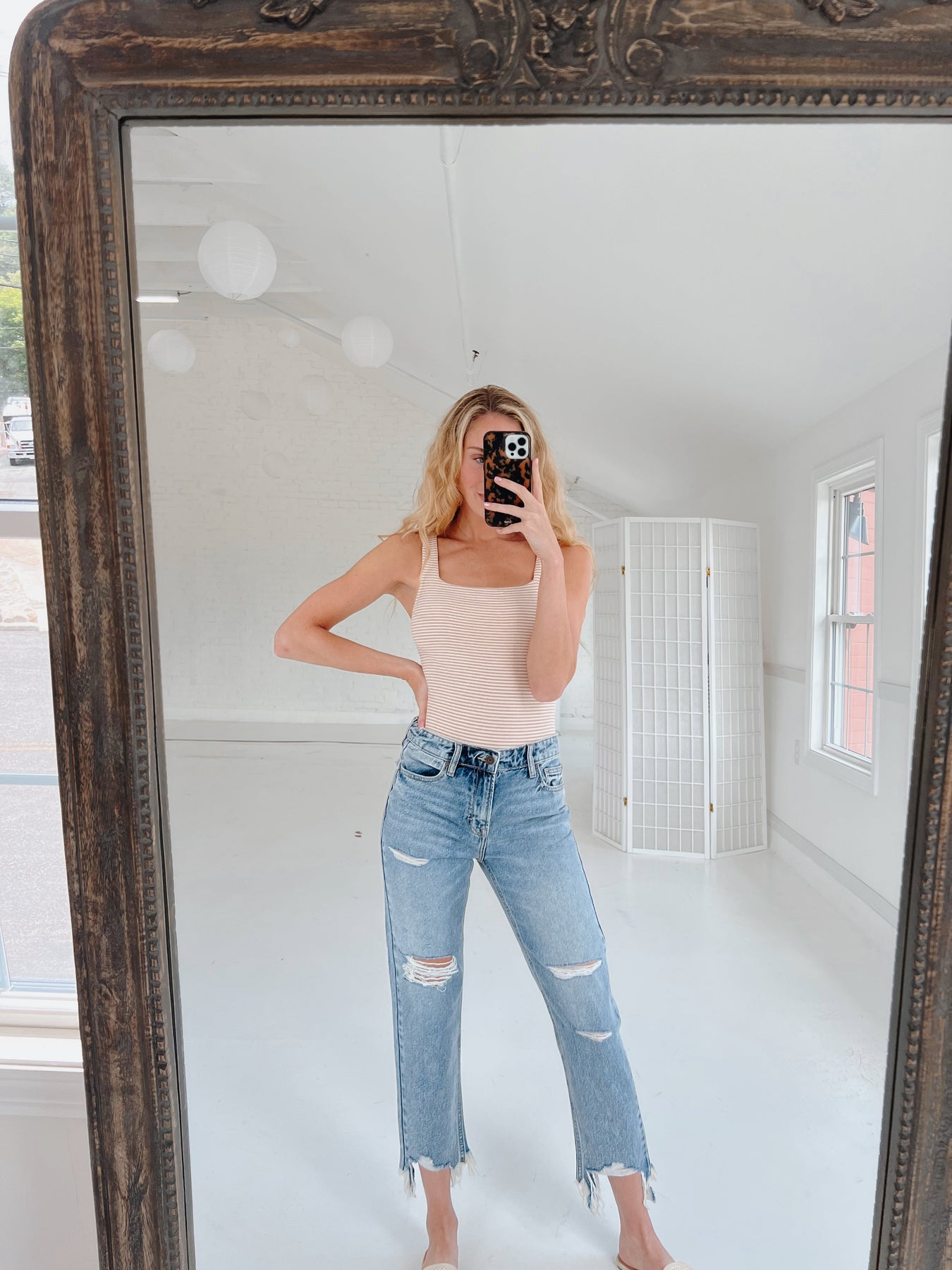 Introducing the Bailey Hi Rise Boyfriend Jeans! Featuring a sea salt coloring, distress at the knee and high waisted fit - it's a no brainer for Summer!