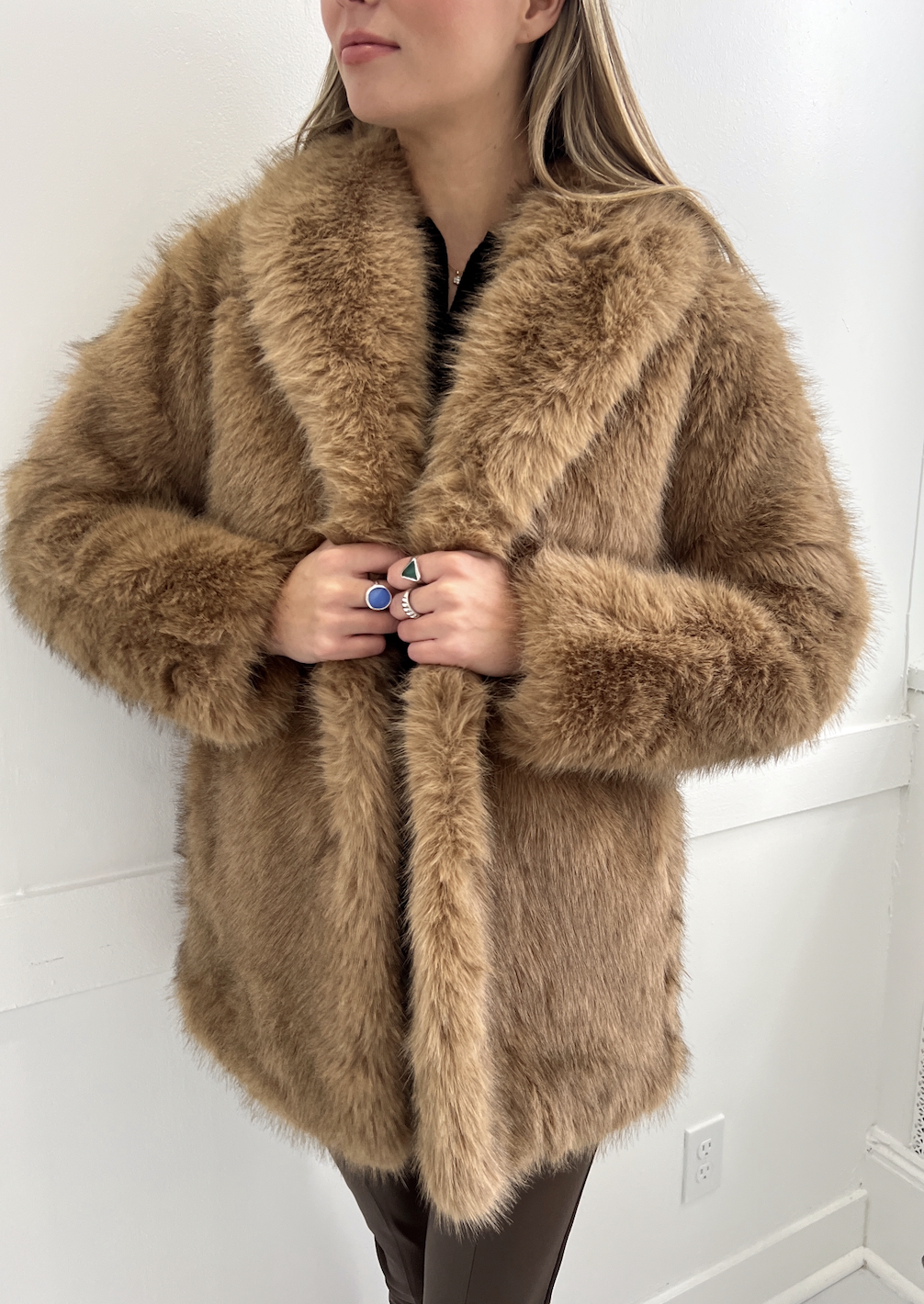 Plush faux fur makes this oversized coat as statement-making as it is warm. The collared design and relaxed fit give it a modern edge, while deep pockets add practicality. The ultimate cold-weather layer for throwing over any look.