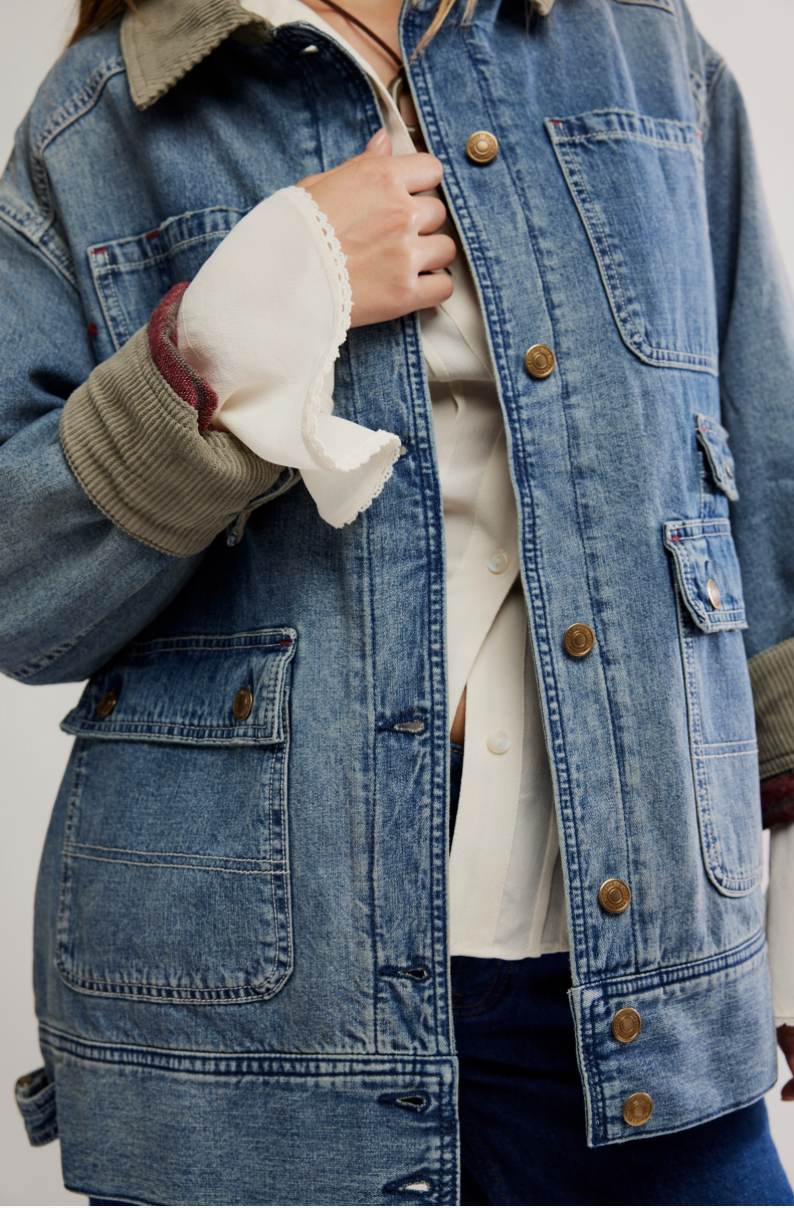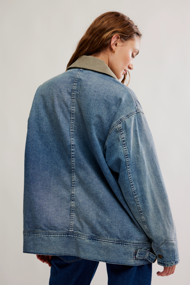 Heritage rules with this classic barn coat from We The Free, featured in a denim fabrication and a slightly longline, oversized silhouette, complete with a sleek cord collar and cozy printed lining.