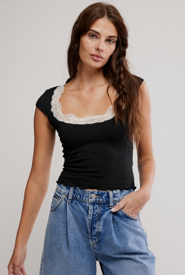 Intricate lace adorns the neckline of this flattering tee from Intimately, featuring a wide square neckline with capped short sleeves and lettuce-edge trim. A forever femme styling option to layer under jackets and more.